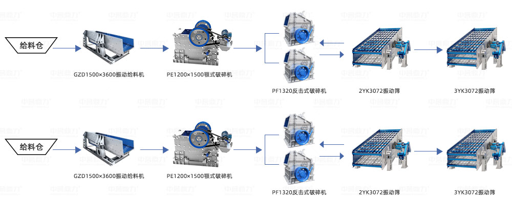 設(shè)備搭配方案:GZD1500×3600給料機(jī)*2、PE1200×1500顎破機(jī)*2、PF1320反擊破*4臺(tái)、2YK3072振動(dòng)篩*2、3YK3072振動(dòng)篩*2、皮帶機(jī)。