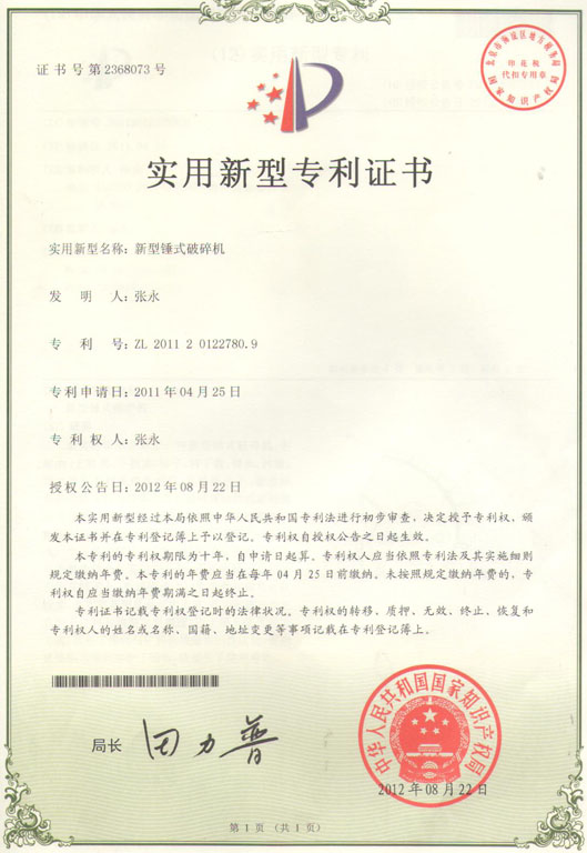 摘要:在公司高層導的英明決策和體員工的共同努力下,河南省新鄉鼎力礦山機械設備有限公司積向家知識產權總局申請的自主研發的 錘式破碎機 新,順利通過相關部門的驗收,獲得此項的證書。這將成為內礦山機械行業新的里程碑,預