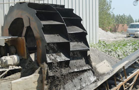洗砂機(jī)工作時(shí),電機(jī)通過(guò)三角帶、減速機(jī)、齒輪減速后帶動(dòng)葉輪緩慢轉(zhuǎn)動(dòng),砂石由給料槽進(jìn)入洗槽中,在葉輪的帶動(dòng)下翻滾,并互相研磨,除去覆蓋砂石表面的雜質(zhì),同時(shí)破壞包覆砂粒的水汽層,以利于脫水;同時(shí)加水,形成強(qiáng)大水流,及時(shí)將雜質(zhì)及比重小的異物帶走,并從溢出口洗槽排出,完成清洗作用。干凈的砂石由葉片帶走,后砂石從旋轉(zhuǎn)的葉輪倒入出料槽,完成砂石的清洗作用。