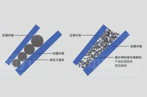 2、層壓縮破碎設計,使破碎發(fā)生在物料和物料之間,破碎效率高;
