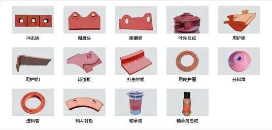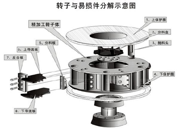 沖擊破制砂機易損件共有15個:上/下軸套(進料斗部位)、減震橡膠、甩輪護口圈、上∕下流道板、沖擊塊、分料錐、板、拋料頭、下料襯環、進料管、上∕下擊打護板、料斗襯環、分料盤、散料盤、周護板等。
